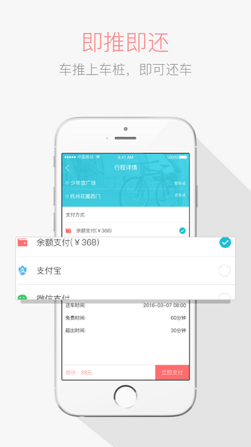 叮嗒出行是一款基于公共自行车的慢行交通共享租赁平台,具备手机租车、在线支付、站点查询、社交互动、移动服务等功能,依托金通股份全国153个城市公共自行车资源,致力于为全国1000万受众会员和2亿潜在会员提供便捷的租还车服务。