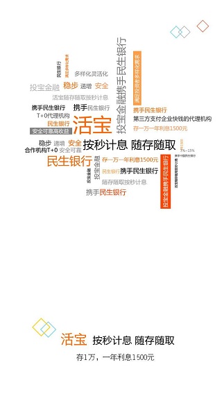 活宝,中国民生银行联手投宝金融倾力打造按秒计息、随存随取理财产品。年化收益7%-15%,存一万一年利息1500元。