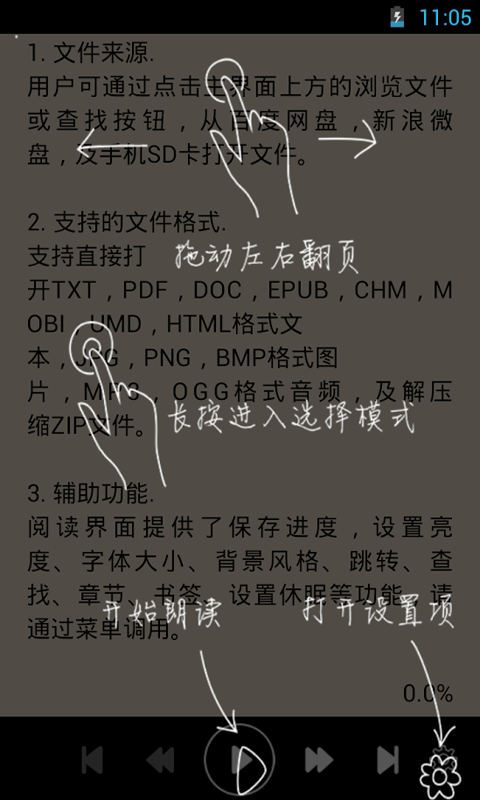 支持图片、音频和文本文件的阅读, 提供浏览本地,新浪微盘,百度网盘文件和查找SD卡功能。特别加入了文本直接转换成语音的有声阅读功能, 用听书的方式随时随地阅读文本和图书。