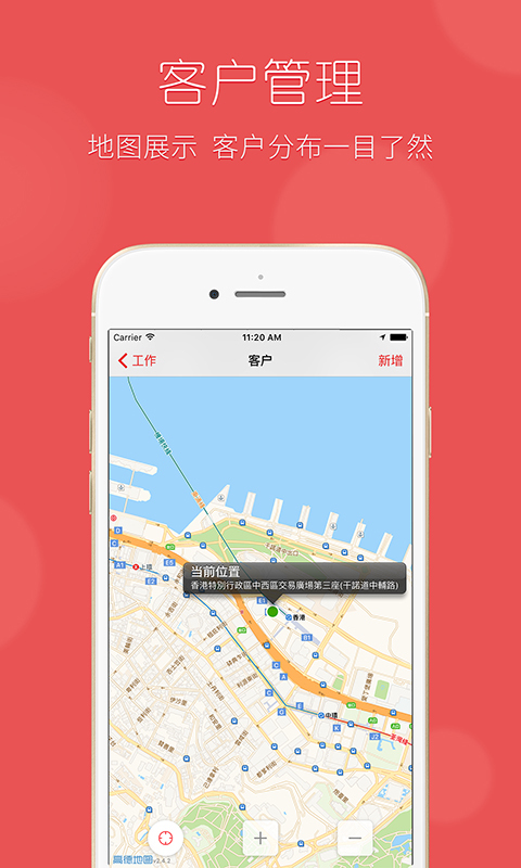 3)标记客户:强大的地图搜索引擎,在手机地图上方便快速标记客户公司的位置,方便外勤人员今后再次对客户进行查找,通过GPS标记信息可直接导航到客户公司。
