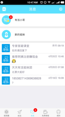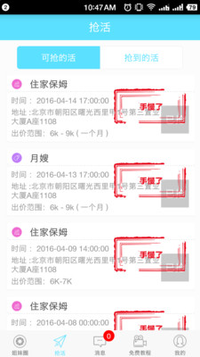 - 抢活儿:凡是通过免费能力认证的姐妹,都可以免费找活儿,不收任何费用,都什么时代了,姐妹们再也不需要家政中介寄生虫!