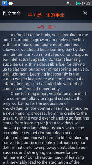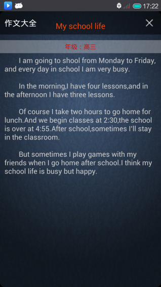 这是一个关于高中英语作文的软件,本软件含近3000篇高中英语作文范文和常用语句、作文指导,含大量高考作文及高考作文指导;高中学业阶段英语作文的参考指导应用。相信大家学习里面的作文,