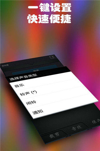 个性铃声制作助app支持录音功能,用户可以简单录制自己喜欢铃声!还有一个更贴心服务,就是一键设置,包括铃声,闹铃,通知等设置。非常方便,快来制作个性铃声!