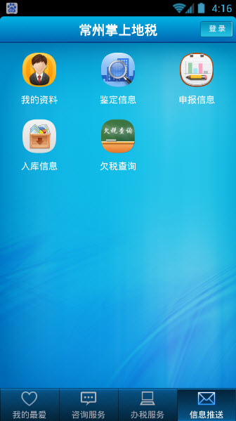 “常州掌上地税”是为纳税人,自然人,社会公众开发的移动终端平台,主要包括了我的最爱,咨询服务,办税服务,信息推送四大模块和20多个功能。