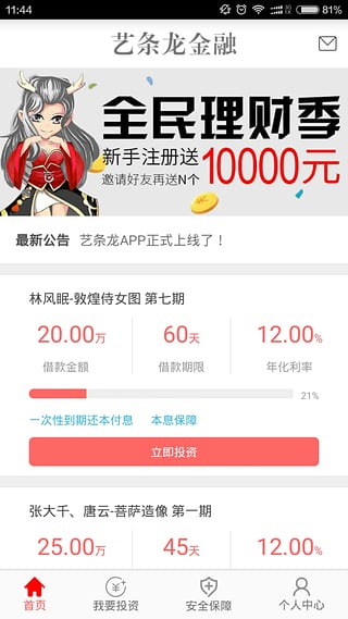 1、艺条龙理财端APP重磅上线,100元起投,预期年化收益8%~18%,秒杀各类宝宝产品。