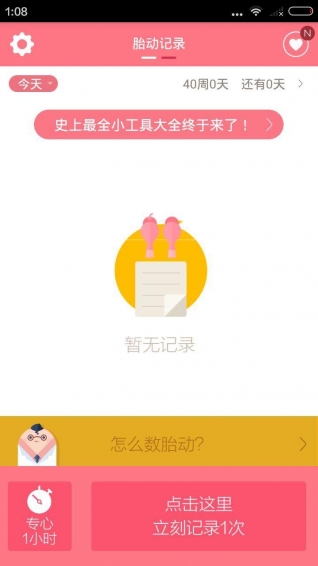 1、 随时记录:可以“专心1小时”记录胎动,也可以不固定1小时,随心记录。宝宝动一下,点一下,方便高效。