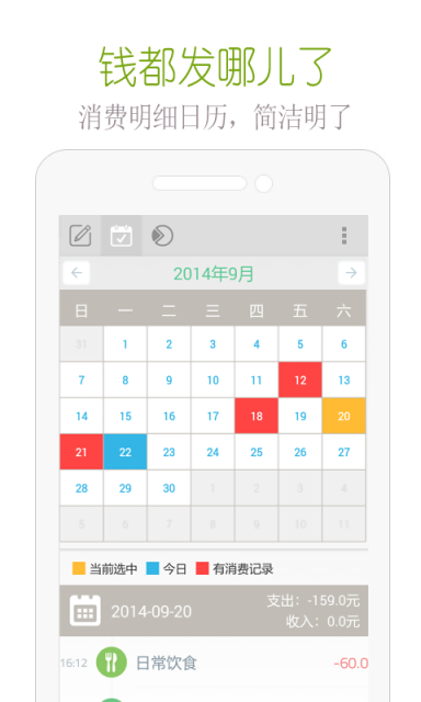 3.可通过日历翻看已经记录过的账单,对每日的消费单独挑出翻阅