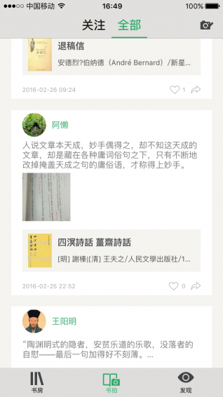 5、如果您在阅读过程中,发现有精彩段落,可以用手机拍照,通过书拍美图进行快速摘抄,同时还可以写下自己当时的感悟或书评,发布到飞芒书房的书拍系统,通过日积月累,您就有了一个数字化的书摘书评资料库,可以把自己的藏书旧典,如水墨,书法,大家名着动态呈现。