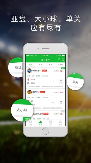 支持竞彩足球亚盘、大小球和胜平负单关玩法。