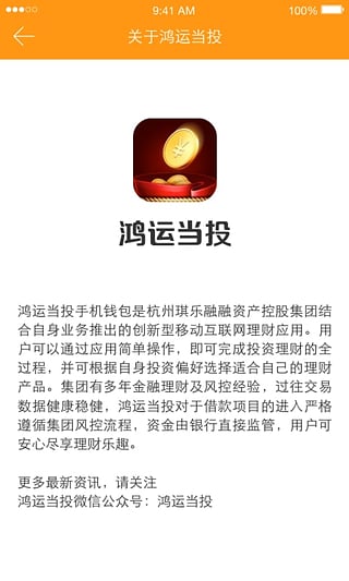 鸿运当投app是琪乐融融资产控股集团旗下的创新型移动理财应用,高收益钱包类理财、年化收益可达12.5%!致力于为用户提供高效便捷的理财服务,让您简简单单理财,随时随地投资,做您口袋中的理财专家。