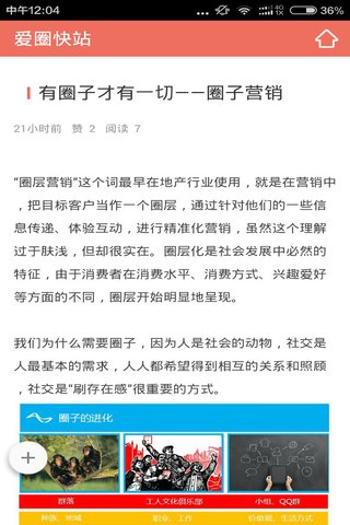 爱圈快站APP,主要是由各类爱好者组成的社交圈子,是志同道合者掌中的社交APP;让有着共同爱好、兴趣、特长等通过圈子来解决社交的问题,包括招聘、教育、电商、购物、健康、育儿等不同的模块,让用户能够解决各种需求问题;同时能够让用户在产品上面除了社交之外也可以利用平台赚钱。