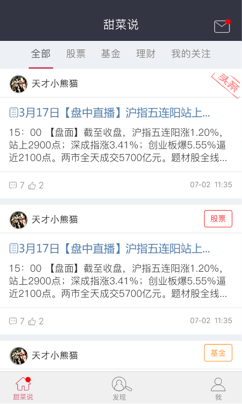 甜菜说app是一款股市社区应用,甜菜说app为用户提供一个投资社区,用户可以在这里获取投资大咖的投资推荐,让用户可以快速了解实时行情,股市分析,帮助用户轻松投资理财。甜菜说app是由天风证券甜菜金融推出的一款理财社区应用。在这里有超多风控人员入驻,帮你严格把关,随时解答你的疑问。实时更新股市数据,让你掌握第一手资料,需要的用户就快来下载使用吧!