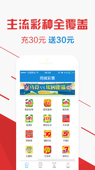 手机可以买彩票啦!同城彩票,专业的手机购彩APP,让您购彩更方便,兑奖更容易,提供竞彩足球、竞彩篮球、双色球、大乐透、胜负彩、任选九、福彩3D、排列三、排列五、七星彩、七乐彩等国内主流彩种的线上购买及彩票兑奖服务。