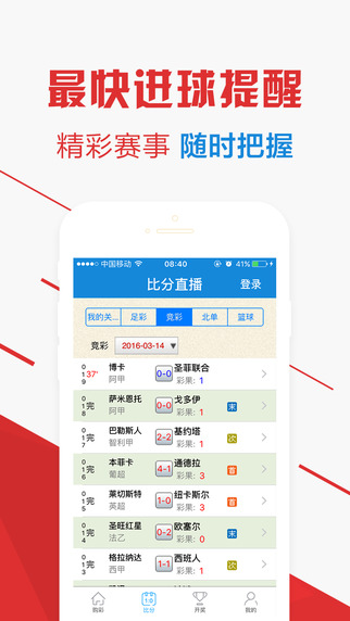 2、比分直播:最专业的竞彩、单场和足彩的比分数据分析、赔率和实况直播。