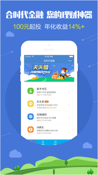 合时代金融,优质的互联网金融平台。总部位于深圳,注册资金5263万人民币。专业风控团队为您的财富保驾护航!定期理财产品14%~18%年化收益,活期理财产品7.6%年化收益,满足您不同的投资需求。合时代金融是一款专业优质的互联网金融平台。在合时代金融app中可100元起投,开启你的理财新世界!17%~18%的年化收益,享受100%本息担保。欢迎下载体验!