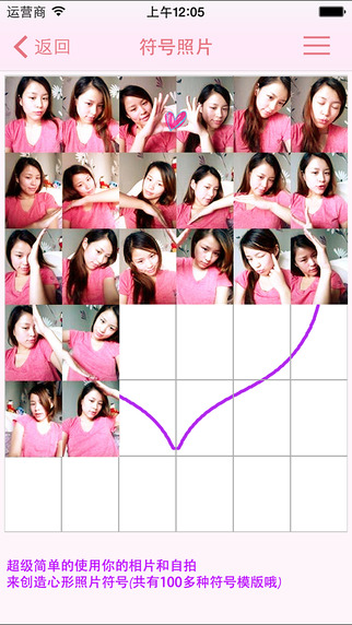-照相机界面的身体走势线帮助你非常容易的拼出符号照片,或者你也可以从相册选择已有照片来,然后程序会帮你拼出最终的符号