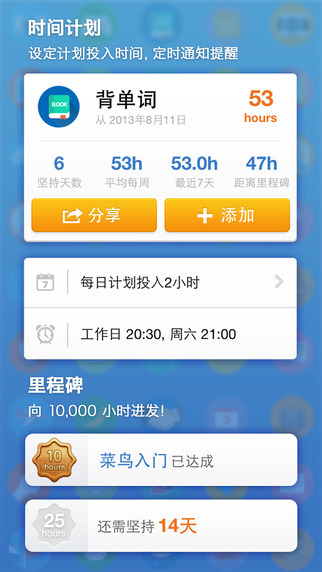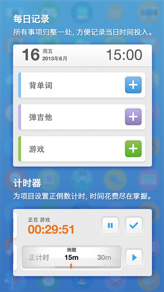 1.每日记录:记录每天不同项目投入小时数。支持提醒和计时。