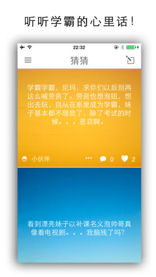 厌倦了朋友圈装,可以在「猜猜」的世界里,看到身边的小伙伴们的真实状态,不管是学霸、校花、叫兽、室友…给你一个真实的朋友圈。