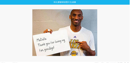 科比感谢球迷告别图片生成器是一款非常具有娱乐性的图片制作软件,今天科比正式宣布退役,诸多科比的球迷都非常不舍得他,如果有科比举牌写上你名字给你告别真是太美好了,科比感谢球迷告别图片生成器可以帮你哦!