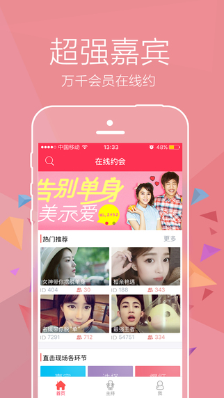 手机交友V1.4活动版本更新概要: 1.代言人活动上线,人人都是交友明星 2.豪送百万价值大礼,登录即领取 3.分享得豪礼功能上线,非诚勿扰快来参加 4.提升稳定性,修复bug