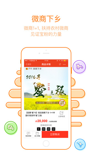 国内领军微商平台钱宝网,基于高频流量入口和雄厚资本,发展以微商为核心,微商下乡和跨境电商并行的“一体两翼”模式,并依托优质微商全力构建小微企业的超级孵化器,打造社交化和移动电商为主体的交易平台的闭环。并通过O2O扫码购串联线上线下,在钱宝内生体系中形成完整的本地化社区服务,打通移动互联商业生态圈的闭环。目前,钱宝网会员数近1亿,入驻48万余商家。钱宝微商,斑斓您的人生!