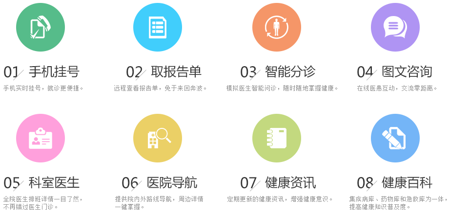 已实现预约挂号、排队叫号、取报告单、科室医生、智能导诊、健康百科、手术动态查询、住院费用清单查询等功能