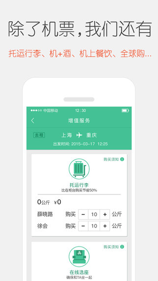 -增值服务:购买航班行李、订餐食、选座位、购保险、接送机一键购买。