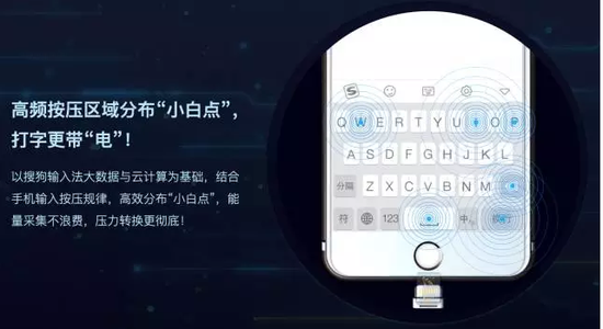搜狗膜膜打产品中值得关注的智能分布小白点,可以采集拼音输入、手写输入甚至语音输入等方式产生的能量。同时以搜狗输入法大数据与云计算为基础,结合手机输入按压规律,对高频按压区域采取高效分布的“小白点”策略,实现能量采集的最大化。