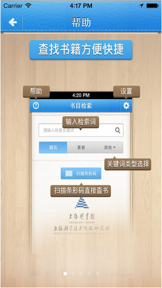 通过条码扫描可以方便的查询上海图书馆是否有图书的馆藏。读者服务,包括已借图书查询及自助续借,个人借阅历史查询,卡功能查询以及我的收藏等功能。