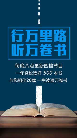 路上读书是我国第一个专注读书的车载fm应用软件,,每晚上八点更新四挡节目,以最简单易用的车载操作模式,解放你的双手一键收听,最超值时间投资方式,半小时读一本好书!