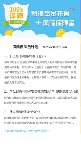 链金所以强大的股东团队和资深行业经验的管理团队为依托,始终把安全保障作为公司发展的生命线,采取“保值增值货物质押+集团强力回购承诺+银行风控体系+品牌保险公司承保+新浪支付第三方资金管理”的运营模式,坚持“合规经营、公开透明、风险最低化”,坚决杜绝资金池、自融标和高息标,实现资金账户与平台隔离、用户资金与平台隔离,切实保障投资人的资金安全和合法权益,力求用最诚恳的态度和最专业的素质服务于广大投资用户。