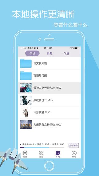 暴风魔镜app是暴风影音推出的智能设备“暴风魔镜”的专用配套APP。暴风魔镜app提供本地播放、在线视频播放、沉浸式游戏、飞屏等功能。同时暴风魔镜app融合了暴风强劲的播放能力与海量视频资源。暴风魔镜app为您带来超IMAX感受的大屏体验。头控交互与全景游戏资源,让您在游戏中真正身临其境。飞屏功能可让您不用数据线,直接观看电脑中的影片。现在就打开魔镜app,把手机放入魔镜设备中,带你离开地球2小时!