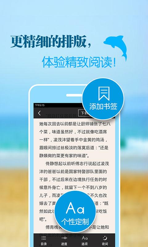 4.贴心的阅读体验:背景切换,仿真翻页,字体缩放,亮度调节,自动书签,夜间视读,个性字体等。