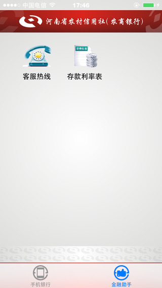 本软件是河南省农村信用社(农商银行)为个人量身打造的iPhone版手机银行服务平台,可让您随时随地享用银行服务,如余额查询、交易明细查询、行内转账、跨行转账、手机充值等。