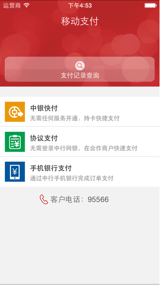 中国银行移动支付APP应用整合了中银快付、手机银行支付、协议支付等多种移动支付产品,为您提供中国银行移动支付服务,你可使用该客户端在手机或PAD上方便快捷地完成移动购物消费,还提供中行电子支付的交易记录查询。