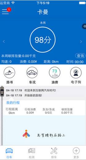 卡曼app可以管理每段行程,详细记录了每段行程的起始时间、行驶距离、花费金额。具体信息还包括瞬时油耗、平均油耗、距离、已用燃油、行车时间、燃油花费、急加速次数、急减速次数,最高速度、平均速度等。