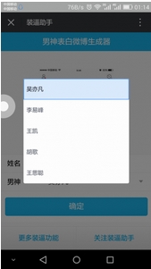 什么?吴亦凡向你表白了?男神表白微博生成器安卓版是一个专门针对喜欢装逼的人设计的一个表白图片装逼软件,男神表白微博生成器安卓版有胡歌、王思聪、吴亦、李易峰、王凯等五位明星/名人共大家选择,可任意填写姓名生成表白图片哦!