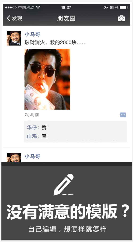 朋友圈神器app是一款超级逼真的朋友圈调戏好友搞怪装blitty的超级神器。想让苍井空出现在你的朋友圈吗,想让吴亦凡、周杰伦、angelababy与你贴近距离吗,快快使用朋友圈神器app吧!在朋友圈装逼的梦想我们帮你承包了!恶搞朋友,恶搞明星,恶搞同学通通木有问题,欢迎下载体验。