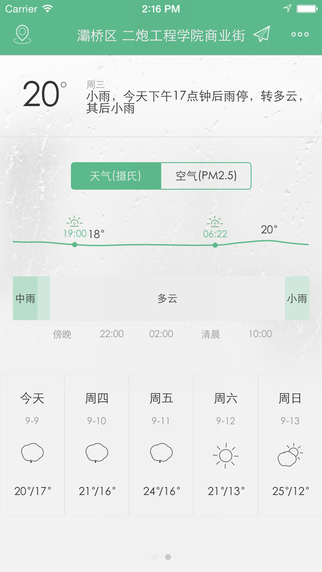 通过定位,不同于其他大部分天气软件只能看到一个笼统的“局部地区阵雨”的预报,彩云天气可以根据你当前位置给你做一个未来一小时内几点几分下雨或什么时候雨停的精准预报,从而帮助你决定出行方案。