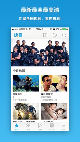 快看影视iOS版是为iPhone用户倾力打造的免费、高品质影视聚合应用。快看影视iOS版依托先进的搜索引擎技术,同步收录优酷、搜狐、PPTV、PPS、乐视、爱奇艺、土豆、风行、腾讯等众多高清视频网站的电影、电视剧、综艺、动漫等影视资源。