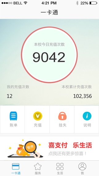 4 丰富:支持一卡通充值,挂失,消费明细查询以及话费缴纳,服务多样化,让生活丰富多彩;