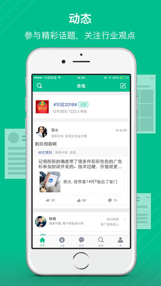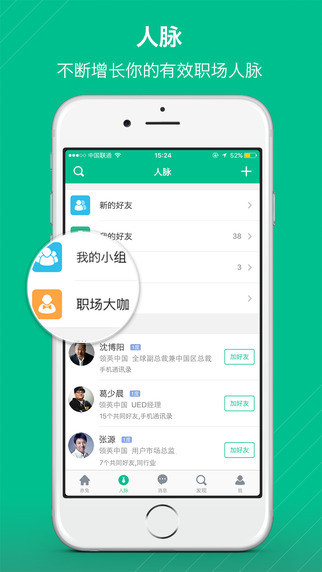 拓展人脉:探索和拓展职场人脉,发现并参与感兴趣的专业、行业小组,充分挖掘实名职场陌生人的价值。