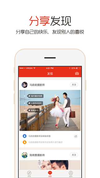 西瓜摄影app聚集了上千名摄影师在活跃滴做图片分享,并且提供摄影服务套餐,西瓜摄影app的摄影师都有三年以上的工作经验,并且每个都有自己的特点。他们每天都把自己认为很棒的作品分享出来。