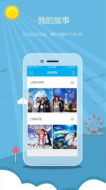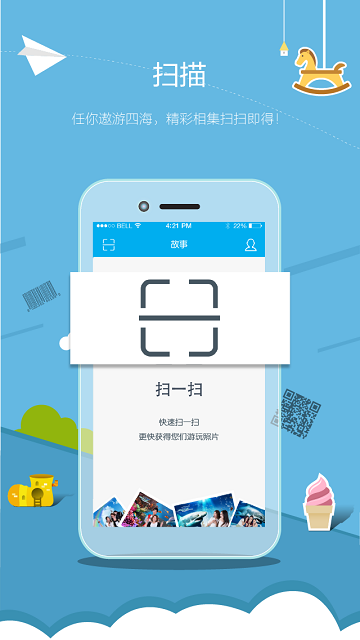 用户通过手机扫描二维码获取或者浏览在景区游玩时由迪彩专业摄影师为该用户所拍摄的精美照片,通过故事的描述方式来展现整个游玩过程。一旦当用户使用VIP特权,则可以使用美图功能,如添加乐园题材的模板元素等等新奇功能。