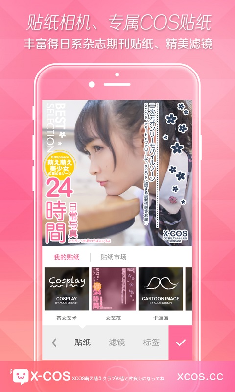 XCOS app为用户提供了COSPLAY美图展示、签约COSER经纪人、摄影资源、高品质专属活动宣传展示和承办。