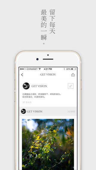 在广场页面,留白App每天为你挑选出来自世界各地的动人瞬间,以一张张优雅的白色明信片向大家呈现出世界另一个角落的精彩。