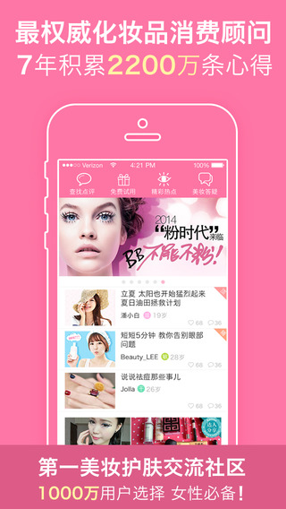 闺蜜美妆:由闺蜜网推出的一款美肤社交平台,无论有什么美肤问题,你都可以来这里提出,让大伙给你支招。每天都有非常多的女性朋友在这里交流,平均每10分钟就有近百条点评、帖子发表。