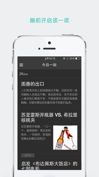 一刻是豆瓣推出的优质内容精选应用,每天为你推荐豆瓣上最新最有趣的文字和图片:精彩文章,热门话题,犀利评论,搞笑图片……统统一网打尽。精选内容短小精炼,让你随时随地获得轻松一刻。