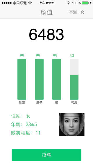并且你的气质也会影响你的颜值,气质包括你的微笑,肤色,年龄等综合信息计算。快来找你的小伙伴比一比谁的颜值最高!!