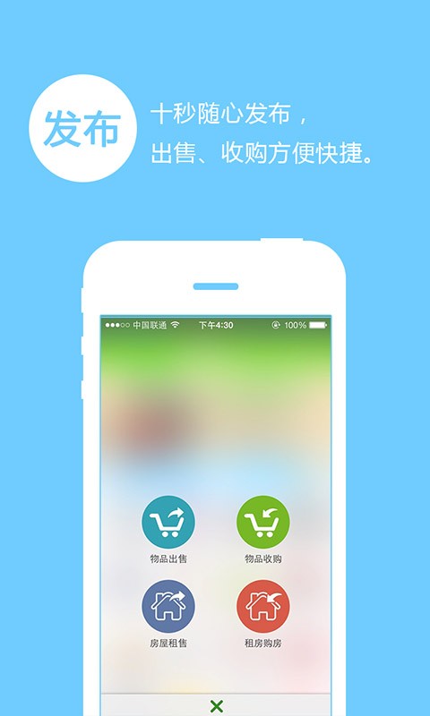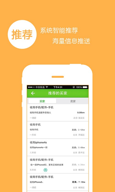 智能推荐,买卖双方系统自动匹配,海量物品信息推送,提升交易成功率,即时会话,简单安全,一步完成;